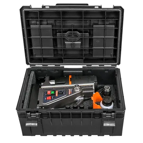 The VersaDrive V60T Pipe Magnet Drill offers all the advantages of the standard V60T with the added benefit of a pipe compatible magnetic base. Two switched permanent magnets are secured to swivelling mounting points and can be positioned as needed, allowing use on tubes and piping with a minimum diameter of 80mm. This also allows use on many contoured surfaces and internal use on large pipes. Magnets can also be positioned horizontally for use as a standard machine on flat surfaces. Supplied with a coolant fed arbor.