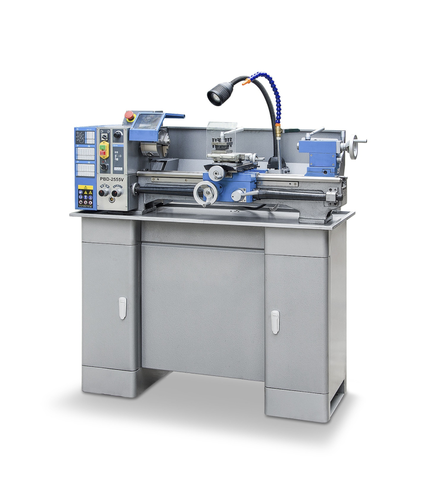 Promac PBD-2555V Economical Lathe Gray cast iron frame for vibration-free machining Electronic variable speed control CW/CCW rotation of the spindle enables threads to be realized Lathe chuck protection, emergency stop switch.