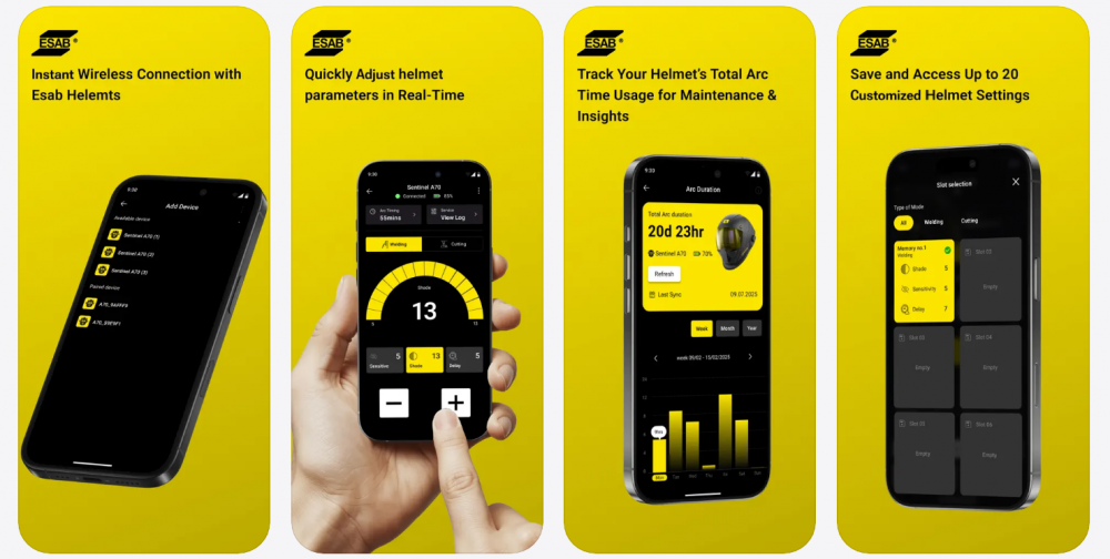 The Sentinel A70 Pro pairs with the ESAB Helmet Connect mobile app to give welders consistent control across jobs and shifts. Sync settings between helmet and phone, store and recall profiles with ease, and track usage to stay organized and repeatable.