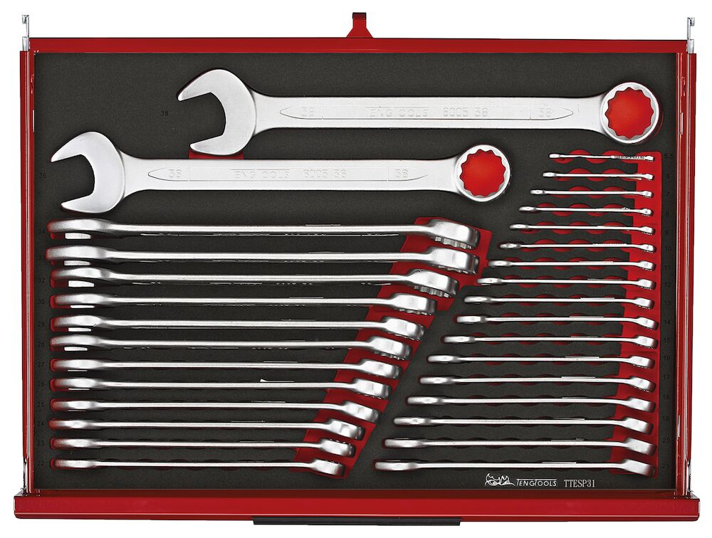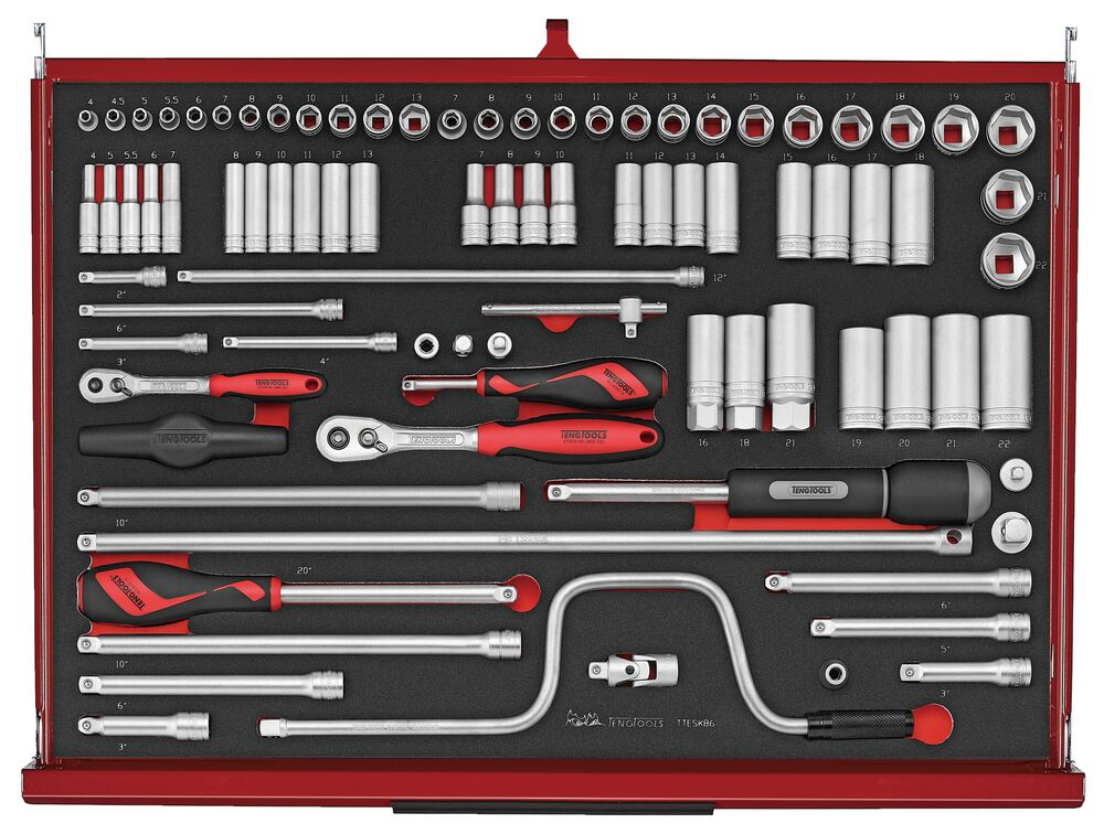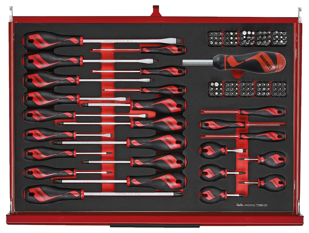 • Compatible with the TengTools Tool Control System                                                                                                                                                                                                                                                                                                                                                   The TengTools 26" PRO35™ tool kit TKW26R278F is designed to meet the needs of professional industrial users. This practical and compact tool kit consists of 278 pieces housed in a durable roller cabinet in matte red. It measures 680 mm in width, 460 mm in depth, and 960 mm in height with the castors mounted. The roller cabinet features a 3-piece heavy gauge steel cabinet frame, and the entire storage unit has undergone a phosphate-free 5-step rust protection process to ensure longevity and corrosion resistance. The roller cabinet has seven fully extendable drawers - five with a height of 75 mm and two deeper drawers at 154 mm, each with a load capacity of up to 40 kg to accommodate a variety of tools in different sizes. All drawers are equipped with smooth-running ball bearing slides and noise-reducing and protective EVA mats. The tool kit offers a comprehensive selection of tools for industrial applications, including 72-teeth ratchets, sockets, combination spanners, various screwdrivers, a ratcheting bit driver with accompanying bits, and 14 vinyl grip pliers designed for good access in confined spaces. The roller cabinet is supplied with tools in 5 of the available 7 drawers, providing room for expansion and customization according to user needs. The tools are organized in precision-cut modules made of high-density, tri-color EVA foam that helps quickly identify missing tools, enhancing efficiency and safety. The roller cabinet has holes on both sides for attaching additional accessories. It features two 5" braked swivel castors and two 5" fixed castors, as well as a comfort handle for easy maneuvering. A 3-digit combination lock keeps the tools secure. The kit also includes a TCA08 paper holder.