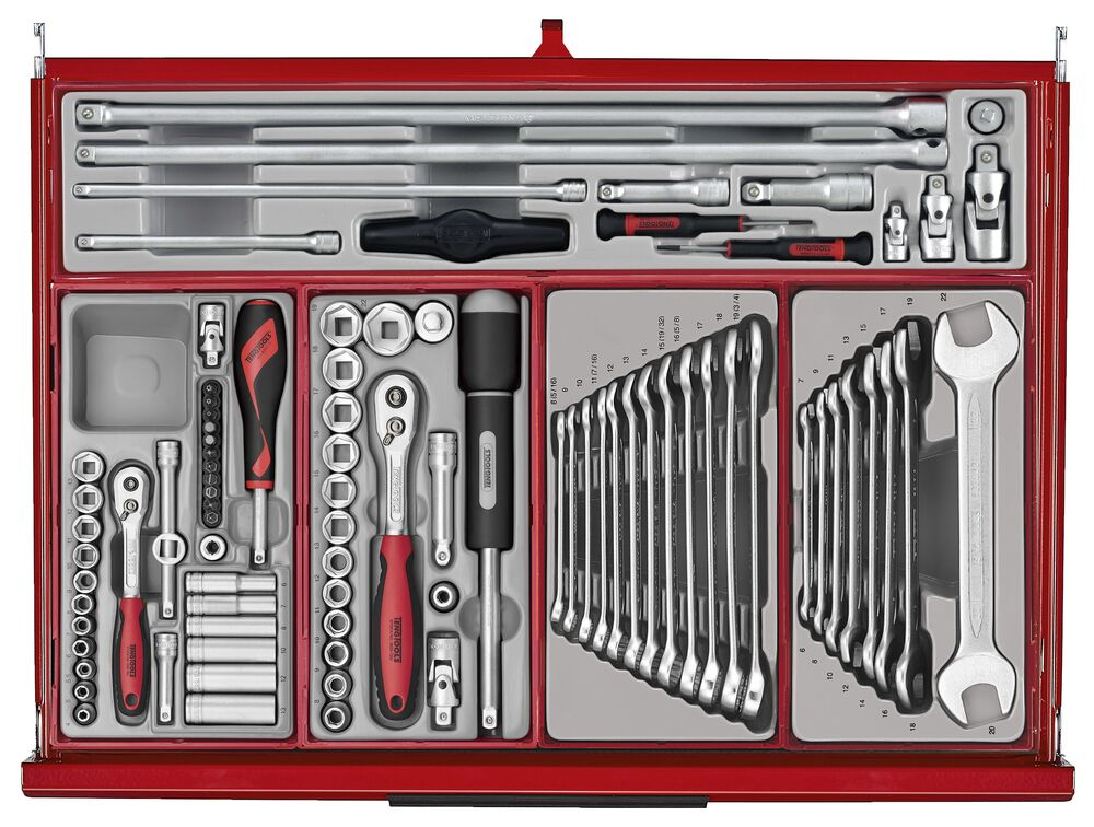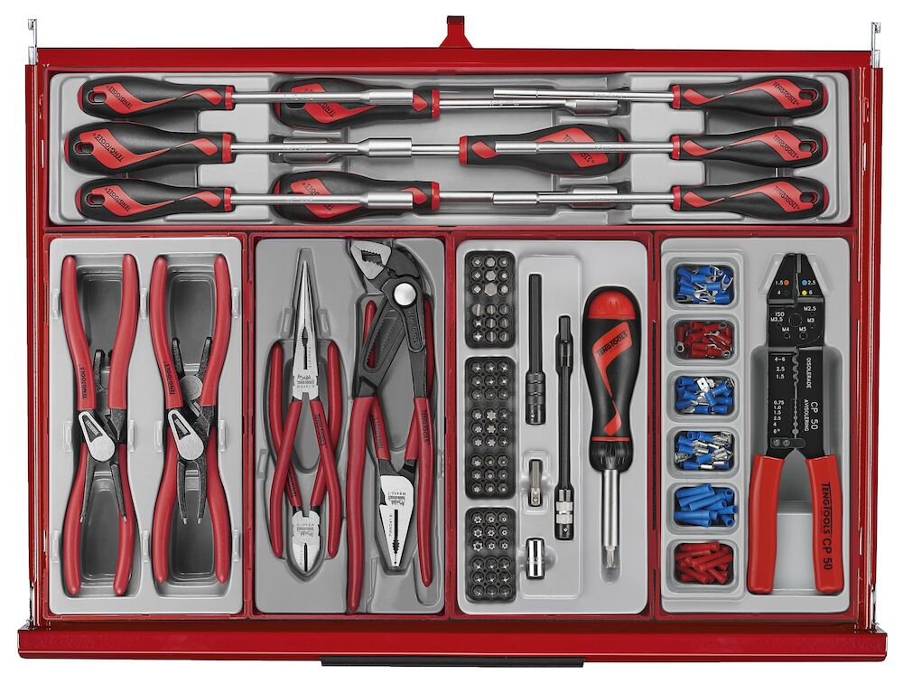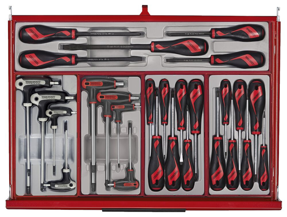 • TengTools Tool Control system for organized and accessible tools                                                                                                                                                                                                                                                                                                                             The TengTools 26" PRO35™ tool kit TKW26R516T in matte red is designed for professionals in various industrial applications. The tools in this 516-piece tool kit are organized in a TSW26R7 roller cabinet that measures 680 mm in width, 460 mm in depth, and 960 mm in height with castors mounted, making it suitable for a variety of industrial environments. It features seven fully extendable drawers: five drawers with a height of 75 mm and two taller drawers at 154 mm, each with a load capacity of up to 40 kg. The tool kit includes a wide range of hand tools such as 1/4", 3/8", and 1/2" drive sockets, bit sockets, ratchets, screwdrivers, bits, T-handle hex keys and TX keys, pliers, and other general tools. Each tool set is organized in dedicated modules that are part of the TengTools Tool Control System, allowing for easy access and quick identification of tools that are out of place. The tools are distributed across six of the seven drawers, leaving room for future expansion and customization. This tool storage features a 3-piece heavy-duty steel chassis designed for daily professional use. The roller cabinet is treated with a phosphate-free 5-step rust prevention process to enhance corrosion resistance. Each drawer is equipped with smooth-running ball bearing slides and is lined with noise-reducing EVA mats to protect both the tools and the storage unit. A 5 mm thick EVA mat is also included for the top surface of the roller cabinet. Mobility and stability are ensured by two 5" braked swivel castors and two 5" fixed castors, complemented by a comfort handle for easy manoeuvring. The roller cabinet also features a 3-digit combination lock for increased security and accessory holes on both sides for additional customization and attachment of accessories.