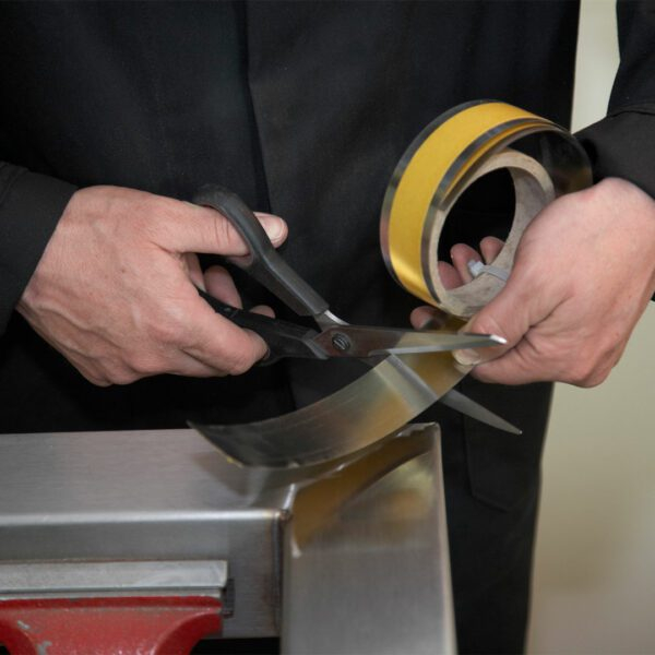 Step 2: Remove the self adhesive backing and apply to the metal surface (ensure the workpiece is cooled prior to applying). Align the edge of the tape precisely where you would like the mitre joint line to appear. Press the Inoxitape firmly onto the work-piece.