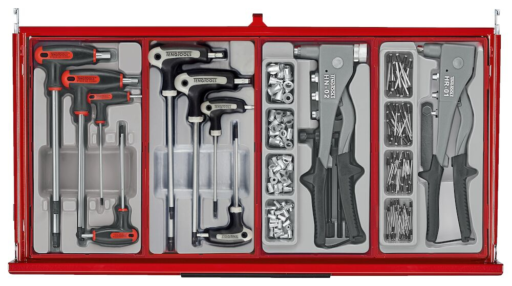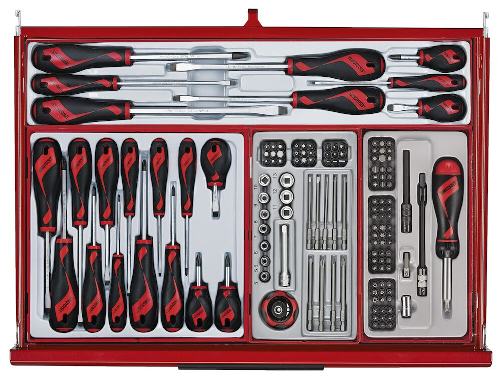 • Utilizes the modular TengTools Tool Control System for efficient tool organization and quick identification of missing items                                                                                                                                                                                                                               The TengTools 26" PRO35™ Mega Master tool kit TKS26R1033T in matte red finish is a comprehensive and versatile 1033-piece collection compiled for professionals in industrial and mechanical fields. This 16-drawer mobile stacked tool storage is built for durability and a great asset in environments where tasks include maintenance and complex assembly. It consists of three storage units: a 9-drawer roller cabinet, a 3-drawer tool chest and a 4-drawer tool chest. Each unit is constructed from high-quality heavy gauge steel and features fully extendable drawers with a loading capacity between 30 to 40 kg, all equipped with ball bearing slides. To reduce wear and tear on both drawers and tools, all drawers are fitted with noise-reducing EVA-mats. Each unit has undergone a 5-step phosphate-free rust prevention process. The roller cabinet is equipped with 5" heavy duty castors, two braked swivel castors and two fixed, providing both easy manoeuvrability and stability. The dimensions are 680 mm in width, 460 mm in depth and a total height of 1570 mm with castors mounted. To ensure that the tools are stored safely, each unit is equipped with a 3-digit combination lock. One of the main features of this Mega Master tool kit is the integration of the TengTools Tool Control System, which makes tool management well organised and efficient. Each toolset within this comprehensive collection is methodically placed in a dedicated module. This way of organising the tools allows for a customisable and dynamic configuration of the toolkit, while making it easy to detect if a tool has been lost or forgotten in a project. The tool kit includes a variety of 1/4, 3/8, 1/2, and 3/4 inch drive sockets, bit sockets, and ratchets, catering to different sizes and types of fasteners. The kit is further enriched with impact tools, combination spanners, screwdrivers, and an assortment of bits. T-handle hex & tx keys, pliers, power grips, and files add versatility to the kit. Pry bars, torque wrenches, taps, dies, and inspection tools are included for more specialized applications. Furthermore, the tool kit contains imperial spanners & sockets, along with a range of general tools, thereby covering most everyday aspects of mechanical and industrial tool needs. Two 32-piece clip rail sets, a paper holder, and fixing brackets to securely attach the tool chest to the cabinet are included