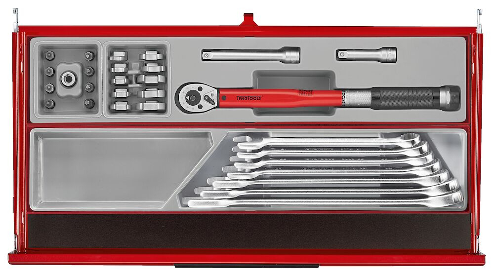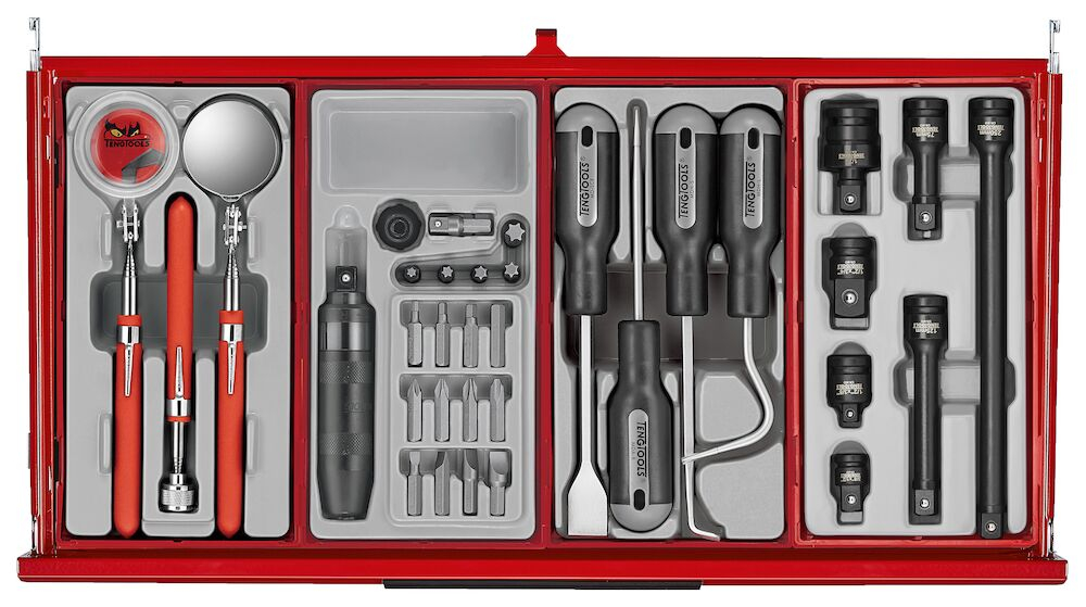 • TengTools Tool Control System for efficient tool organization                                                                                                                                                                                                                                                                                                                                   The TengTools 26" PRO35™ stacked tool kit in matte red TKS26R1034T is comprehensive with 1034 pieces, designed to meet the needs of professionals in various industrial sectors. The tool storage unit measures 680 mm in width, 460 mm in depth, and 1590 mm in height with the castors mounted. The base of the storage unit consists of the TSW26R7 roller cabinet, which has seven drawers: five measuring 75 mm in height and two larger ones at 154 mm, each with a 40 kg capacity. Complementing this is a TSM26R3 tool chest, featuring three drawers - two at 50 mm and one at 75 mm in height. The setup is completed by the TST26R4 tool chest on top, housing four drawers, three of which are 50 mm high and one 75 mm. Both tool chests are equipped with recessed side handles for easy relocation. The tool kit encompasses a broad spectrum of tools including 1/4, 3/8, and 1/2 drive 12-point sockets, bit sockets, ratchets, impact tools, combination spanners, screwdrivers, bits, T-handle hex & tx keys, pliers, files, pullers, drills, and measuring tools, all organized in the TengTools Tool Control System. This system ensures an orderly workspace and aids in quickly identifying missing tools. All drawers across the units are lined with EVA mats and fitted with smooth running full extension ball bearing slides, enhancing tool protection and drawer operation. The durability of the stack system is assured with its heavy gauge top-quality steel construction, complete with a 5-step phosphate-free rust prevention process to resist wear and corrosion. Each unit is secured with a 3-digit combination lock, with an option to switch to a key lock. Mobility is facilitated by two 5" braked swivel castors and two 5" fixed castors, along with a comfort grip handle on the roller cabinet. The roller cabinet also feature accessory holes for customization and comes with a paper roll holder for added convenience.