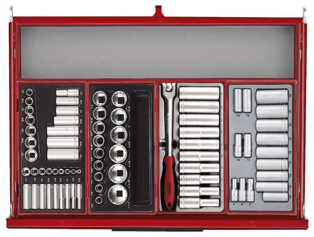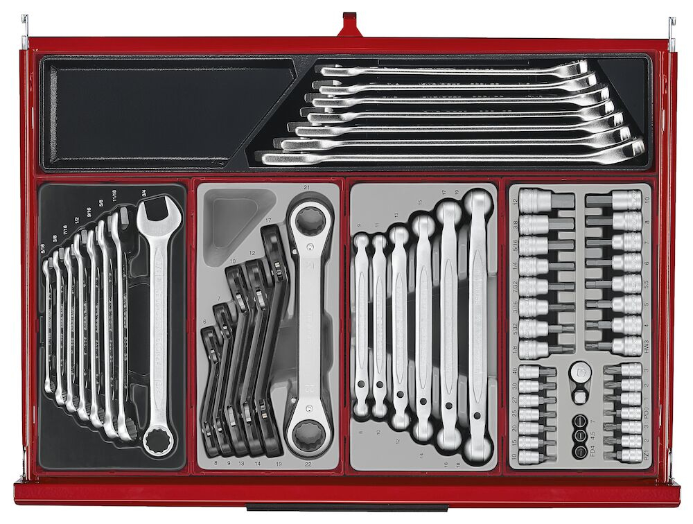 • Part of the TengTools Tool Control System for organised tool storage                                                                                                                                                                                                                                                                                                                        The TengTools 53" PRO35™ ‘Monster’ TKS53R1295T in matte red colour is a comprehensive and versatile tool set with 1295 pieces. The tool set is designed for professionals and is ideal for applications in the automotive industry and heavy vehicle maintenance. The tool set consists of a TSW53R9 roller cabinet and a TST53R10F tool chest, which together have a total of 19 fully extendable drawers each with a load capacity of 40 kg per drawer. The TSW53R9 roller cabinet has nine drawers, six with a height of 75 mm, two 154 mm high drawers, and a top drawer with a height of 160 mm intended for larger tools. The TST53R10F tool chest offers ten 75 mm high drawers. Each drawer is equipped with smooth-running ball bearing slides and features a noise-reducing EVA mat that also protects both the tools and the storage unit. The tool kit includes a broad range of tools: 1/4, 3/8, 1/2, and 3/4 drive sockets, bit sockets, ratchets, impact tools, combination spanners, screwdrivers, bits, T-handle hex & tx keys, pliers, torque wrenches, taps, dies, drills, inch spanners, inch sockets, inch hex, pullers, inspection tools, files, scrapers, general tools, and a selection of VDE tools. Each toolset is organized in dedicated modules as part of the TengTools Tool Control System, promoting an organized workspace and aiding in the quick identification of missing tools. Both the roller cabinet and tool chest are made of heavy-duty steel treated with a phosphate-free 5-step rust protection process for long-lasting durability. To facilitate movement, the unit has four heavy-duty 6" swivel castors, two of which are braked to ensure good stability. The total size of the stacked storage unit is 1350 mm wide, 460 mm deep, and 1543 mm high with the castors mounted, making it a spacious yet manageable unit for professional environments. Enhanced security is provided by 3-digit combination locks on both units. A comfort handle on the side of the roller cabinet makes it easy to manoeuvre, and the tool chest has recessed side handles for lifting. In addition, the roller cabinet has holes on both sides for accessories and a shelf at the bottom of the side for storing long items. Supplied with fixing brackets (TCF07) for extra stability.
